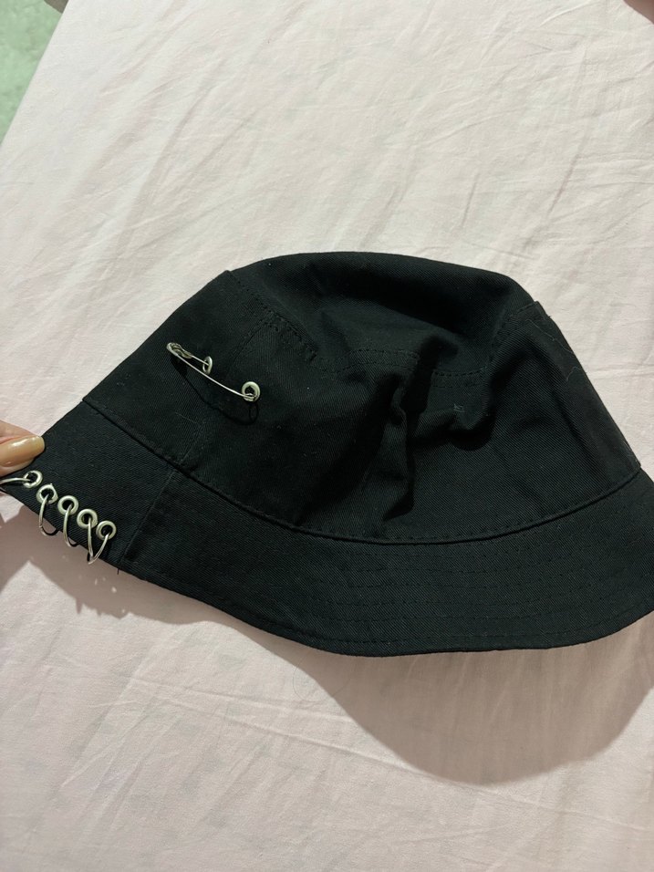Parlak siyah renkte, tokalı ve emniyet iğneli detaylara sahip kova şapka. Sentetik kumaştan, grunge punk sokak tarzını yansıtır.