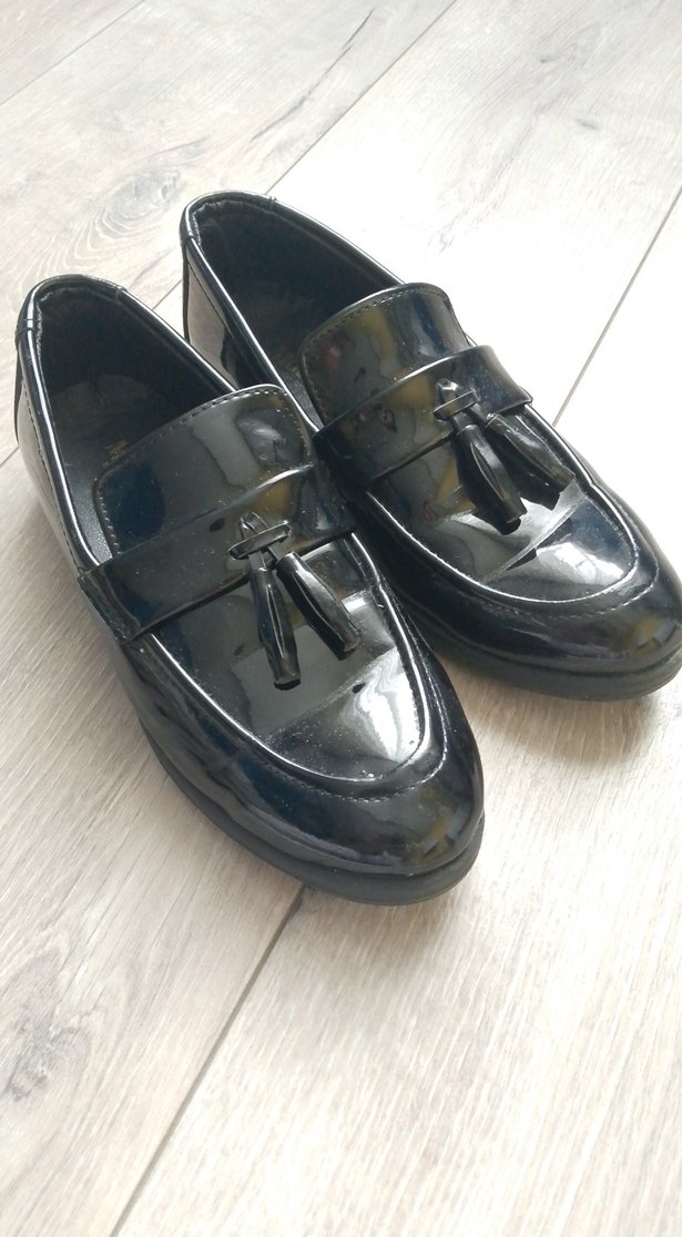Parlak siyah renkte, püsküllü ve gotik tarzda erkek çocuk loafer ayakkabı. Kauçuk malzemeden üretilmiş, desensiz tasarım. bir kez giyildi