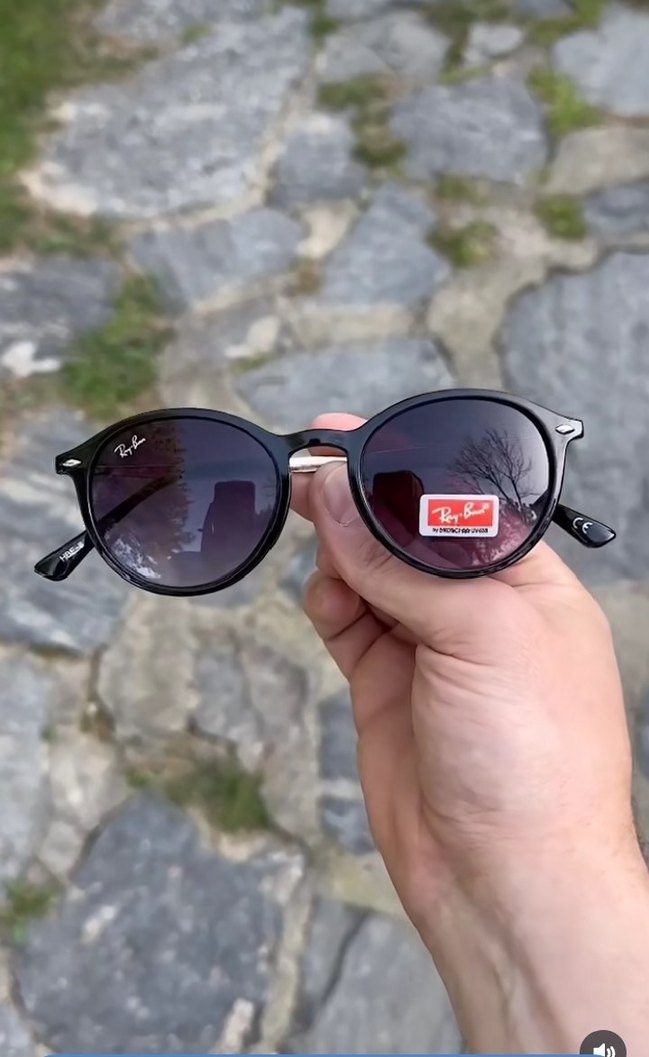 Parlak siyah çerçeveli ve gri camlı Ray-Ban kadın güneş gözlüğü, sokak stili ve rock punk havasına uygun yuvarlak tasarım.