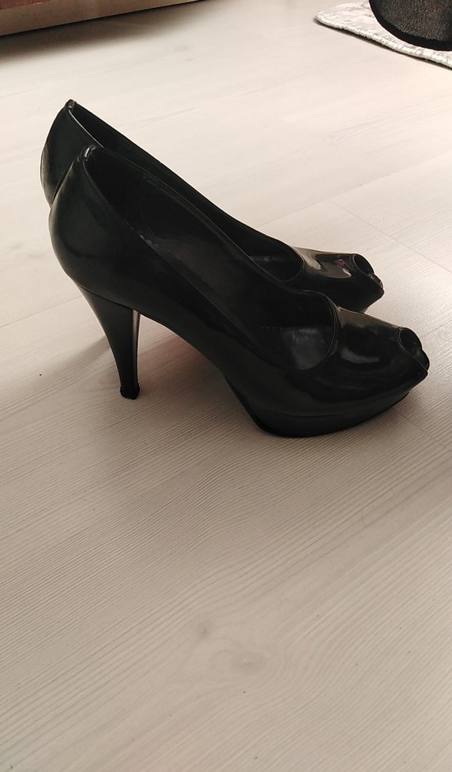 Parlak siyah renkli, kauçuk malzemeden yapılmış stiletto topuklu ayakkabılar. Klasik gotik tarzda, desen içermeyen ve romantik akşamlar için uygun.