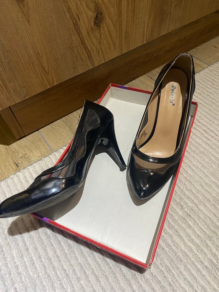 Parlak siyah rugan malzemeden yapılmış, baskılı desene sahip stiletto topuklu ayakkabılar. Ofis için uygun, gotik ve klasik Paris tarzını birleştirir. 2 det temiz kullanılmıştır