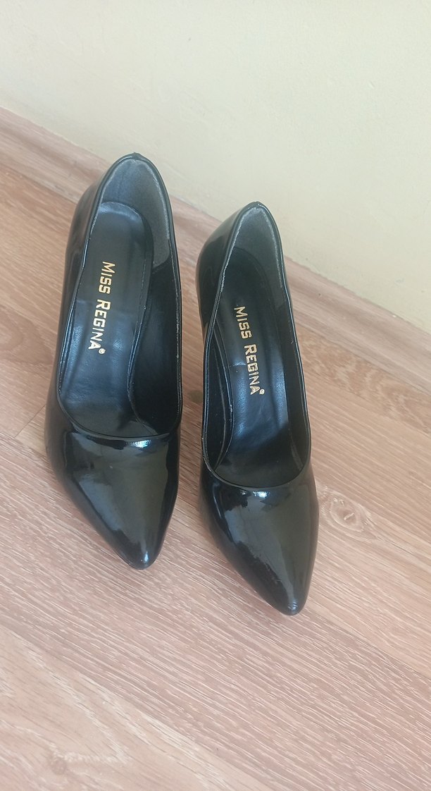 Parlak siyah rugan malzemeden yapılmış sivri burunlu stiletto topuklu kadın ayakkabılar, cesur ve iş ortamı için uygundur. Desensiz şık tasarım sunar.