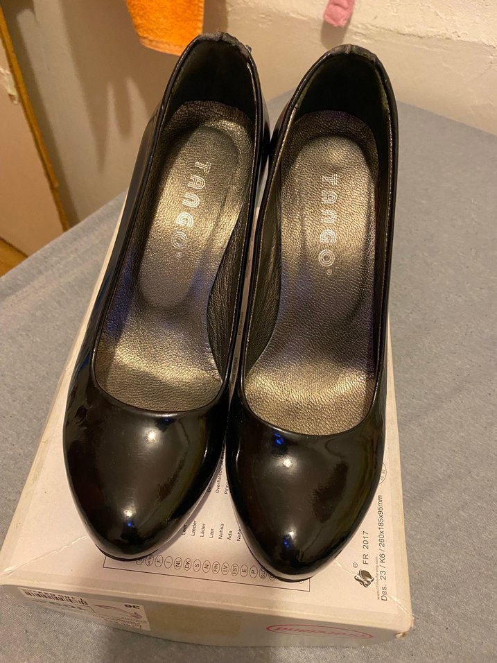 Parlak siyah rugan malzemeden yapılmış, cesur gotik tarzda, desen içermeyen stiletto topuklu kadın ayakkabısı.