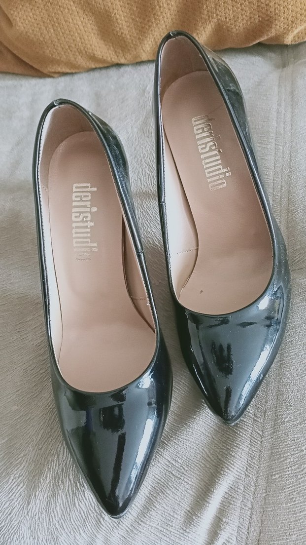 Parlak siyah rugan malzemeden yapılmış, klasik ve gotik stilettolu kadın ayakkabısı. Ofis kullanımı için uygun, sivri burunlu tasarım. Marka: Deristud.