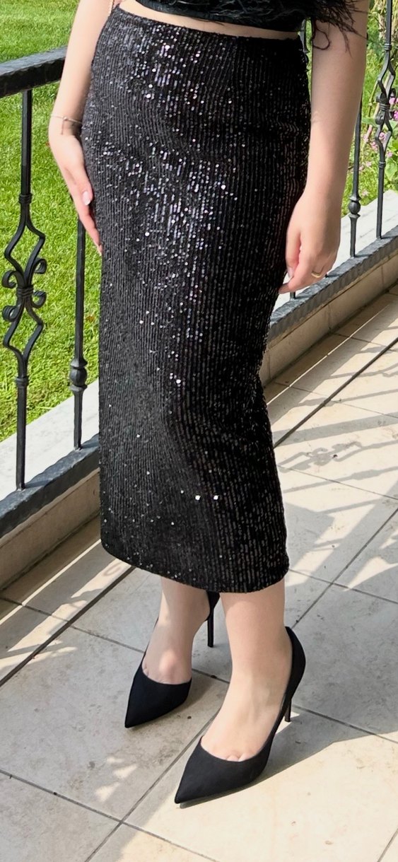 Parlak Siyah Simli Midi Etek
