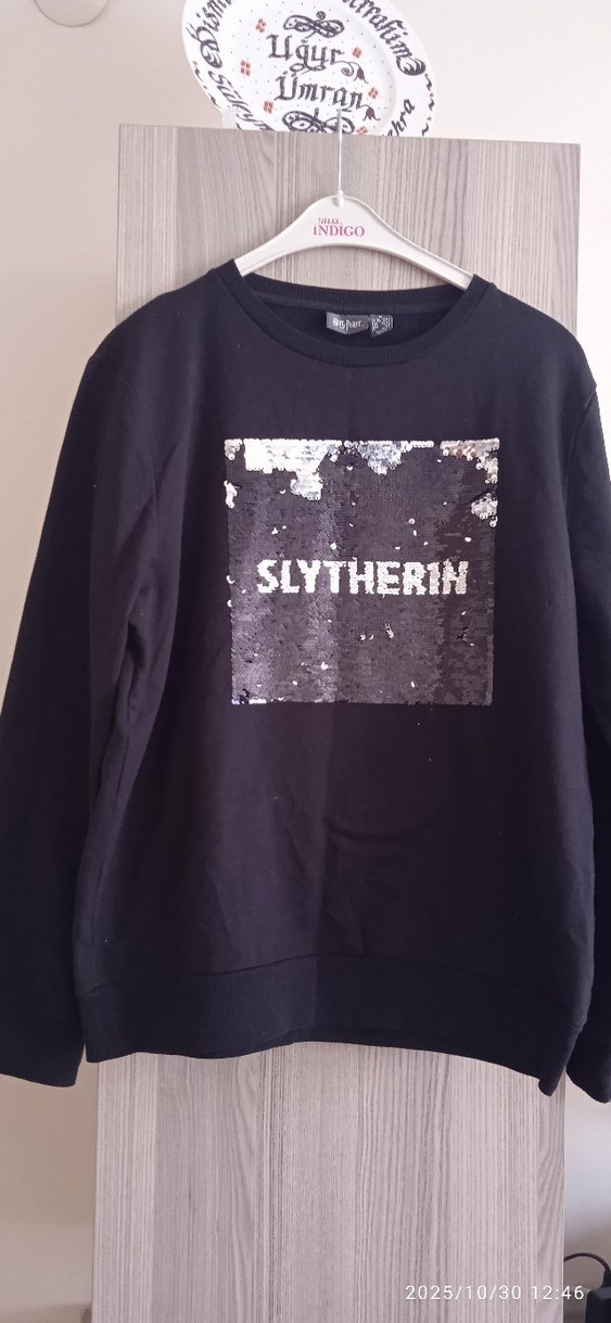Uzun kollu, yuvarlak yaka ve bol kesim siyah sweatshirt. Önünde parlak simli Slytherin baskısı bulunur. Goth ve athleisure tarzlarını yansıtır.✨
