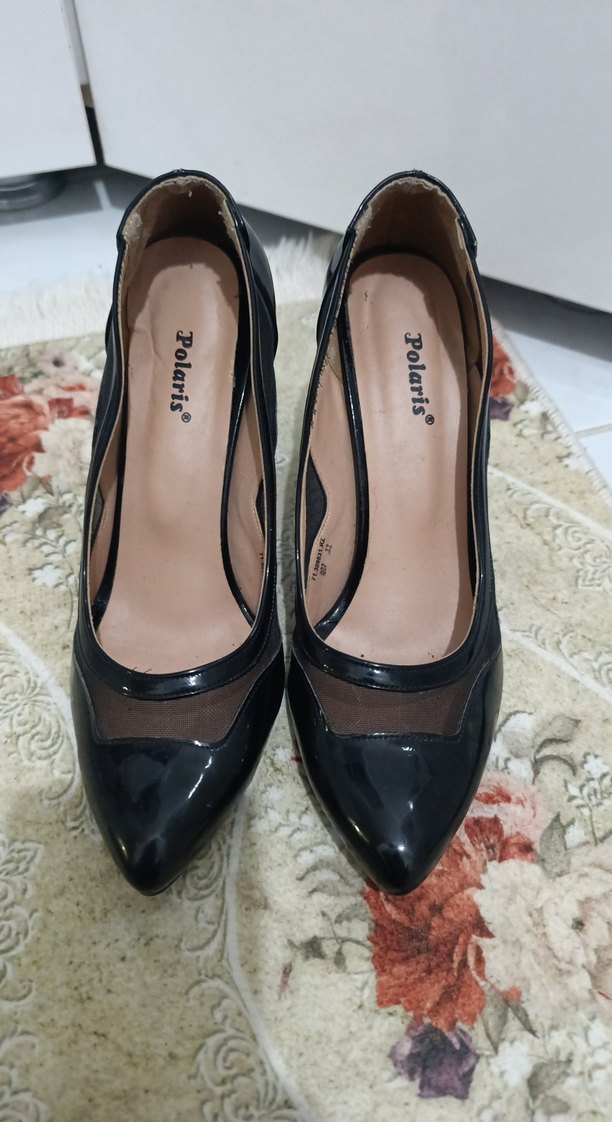 Polaris marka, parlak siyah stiletto topuklu, baskılı ve kauçuk malzemeden yapılmış, ofis için uygun klasik ve gotik tarzda kadın ayakkabısı.