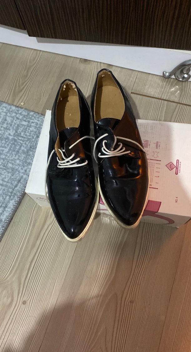 Parlak siyah renkte, lastik tabanlı ve stiletto topuklu kadın klasik ayakkabılar. Günlük kullanım için uygun, sade ve desensiz tasarıma sahip.ikinci fotoda içinde hasarı var uzun süre kutuda kaldığı için böyle ama dışında hiç bir hasarı yok