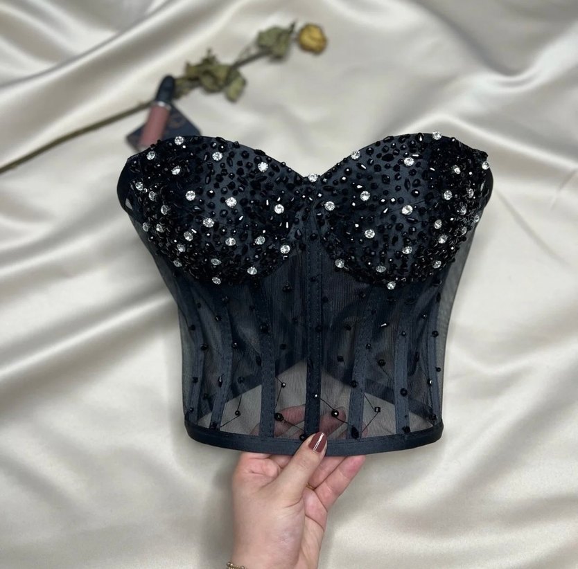 Siyah straplez mini bustiyer, sentetik kumaştan üretilmiş, işlemeli ve parlak payetlerle süslenmiştir. Strappy askıları ve fit kesimiyle partiler için uygundur. ✨