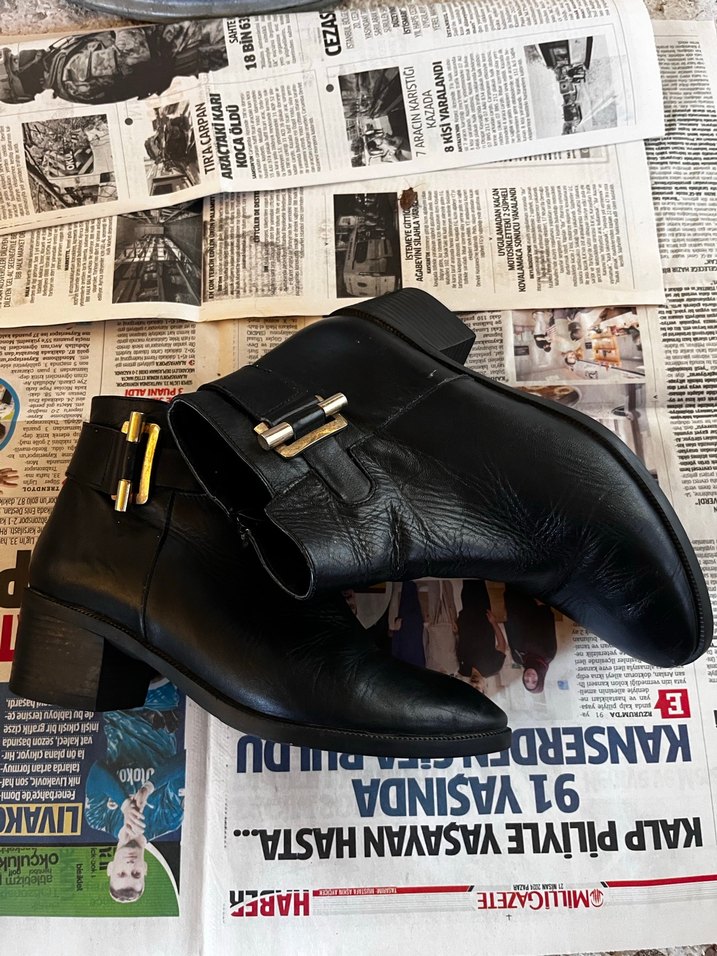 Parlak siyah deri biker kadın botlar, tokalı detaylar ve kalın topuk ile şık bir günlük tarz sunar.