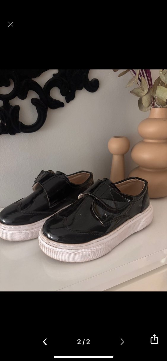Parlak siyah yüzeyli, tokalı ve beyaz kauçuk tabanlı erkek çocuk ayakkabısı, günlük sokak stili için uygundur.