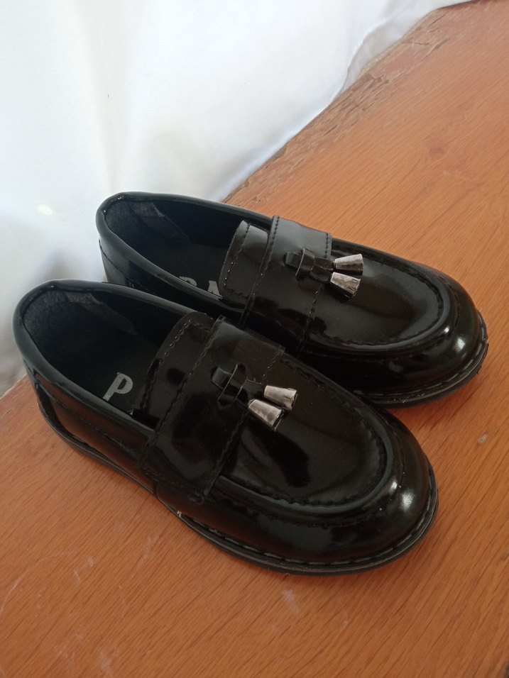 Parlak siyah renkte, tokalı ve düz desenli erkek çocuk özel ayakkabısı, klasik gotik tarzda, lastik malzemeden üretilmiştir.