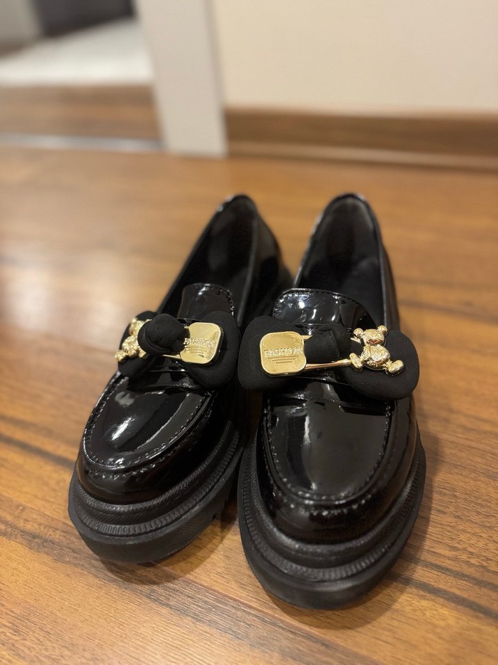 Parlak siyah, tokalı kadın loaferlar, blok topuklu ve hafif leopar desenli. Klasik ve zarif Parisli gotik tarzıyla günlük kullanım için uygun.sorunsuzdur