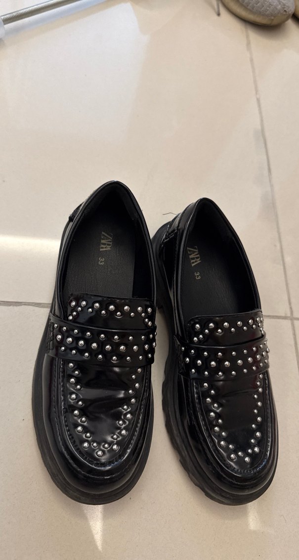 Parlak siyah kauçuk malzemeden yapılmış, tokalı ve metal zımbalı kız çocuk loafer ayakkabı. Goth rock punk tarzına uygun, desensiz tasarım.