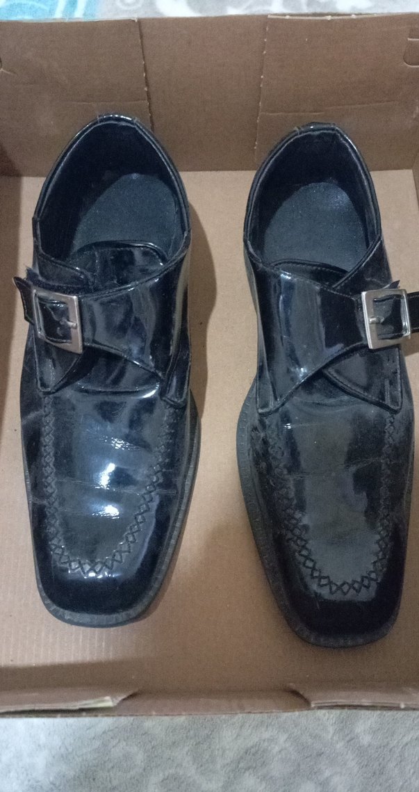 Parlak siyah renkte, tokalı ve lastik malzemeden yapılmış klasik erkek çocuk ayakkabısı.