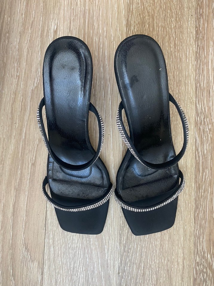Parlak siyah tokalı bantlı kadın ayakkabısı. Minimalist ve çağdaş tasarım, romantik akşamlar