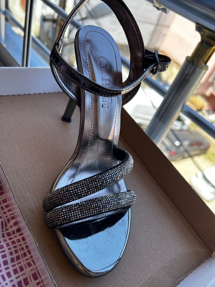 Sayılı giyildi .Parlak siyah topuklu kadın ayakkabısı, tokalı kayışlıdır. Modern ve klasik şıklığı bir arada sunar, romantik akşamlar için uygundur.