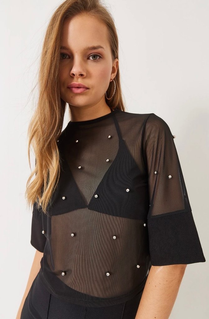 Parlak siyah transparan bluz, kısa kollu ve bol kesimdir. Mini boyda, sokak modasına uygun, küçük süslemelerle detaylandırılmıştır. ✨