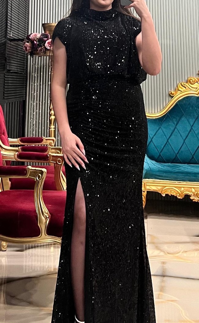 Parlak detaylarla süslenmiş, tek vücuda oturan uzun siyah abiye elbise. Kayık yaka ve ince askılarla klasik ve modern tarzı birleştirir. Yüksek yırtmaçlı, desenli kumaş parti için uygun. Sadece 1 kez giyildi