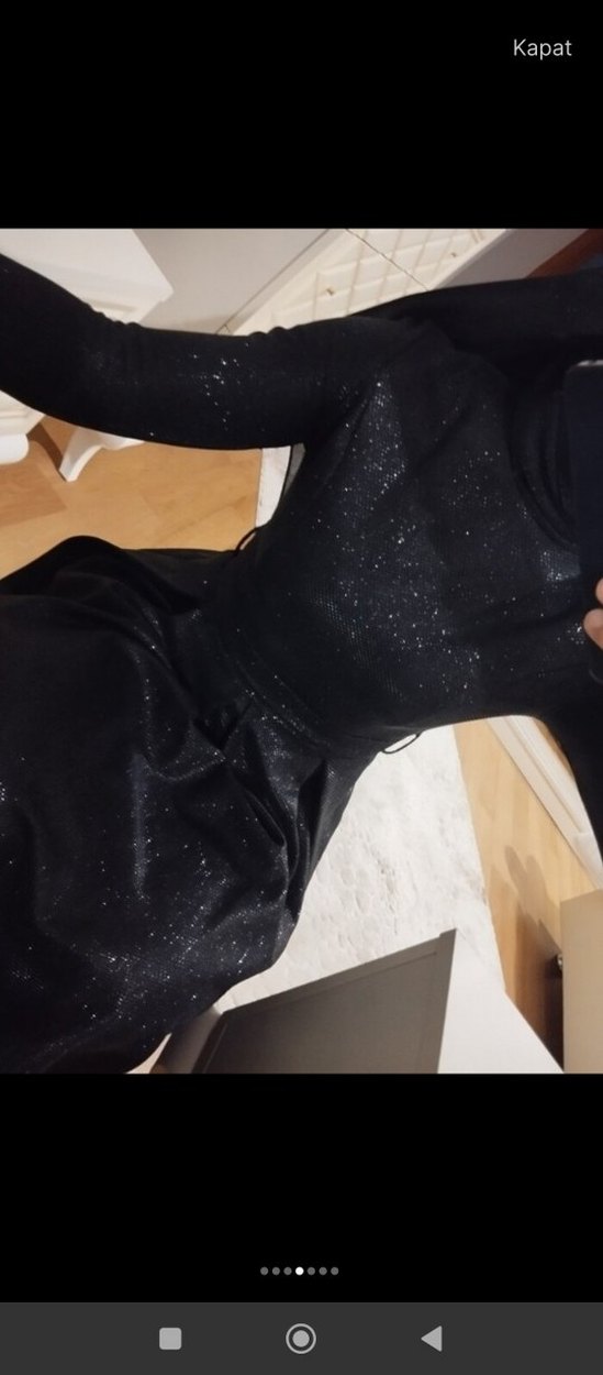 Parlak simlerle süslenmiş, yüksek yakalı ve askılı kollu, vücuda oturan uzun siyah abiye elbise. Parti için avant-garde tarzına uygun. ✨
