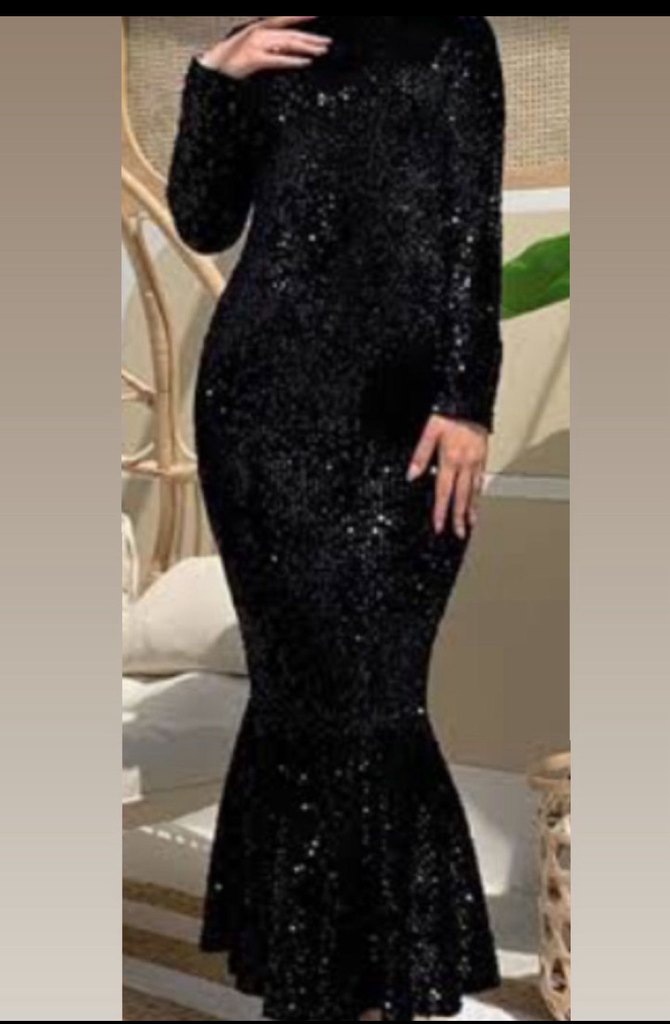 Siyah, uzun kollu, dar kesim uzun abiye elbise. Parlak ve desenli dokusu ile gösterişli partiler için uygundur. ✨
