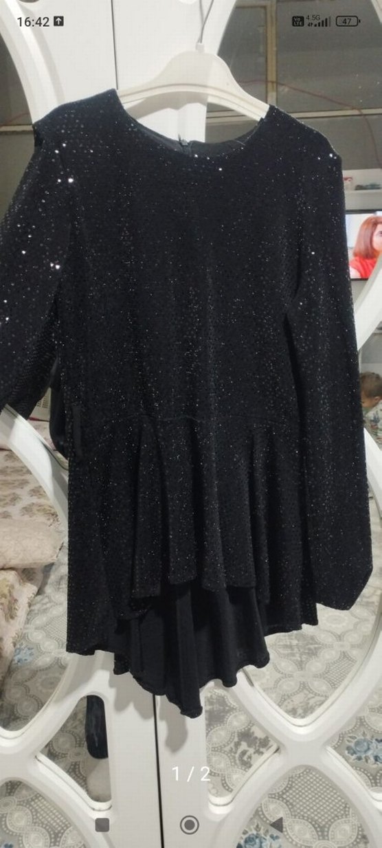 Parlak simli, uzun kollu, salaş kesim siyah gece elbisesi. Yuvarlak yaka ve uzun boyuyla göz alıcı bir tarz sunar. ✨