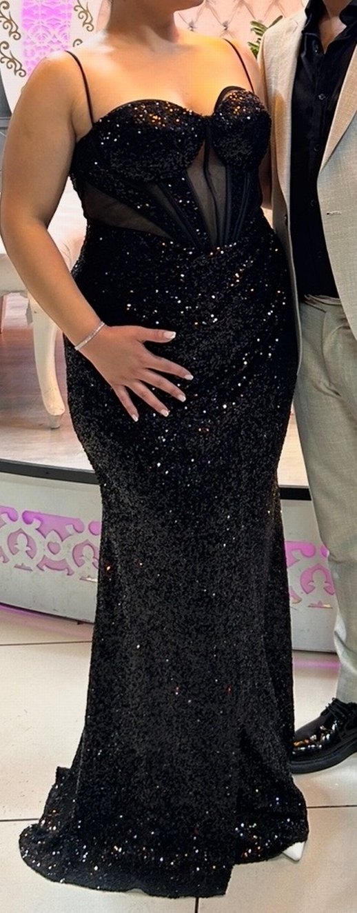 Bu dar kesim uzun abiye elbise, V yaka ve ince askılarla birlikte parlak simlerle süslenmiştir. Gotik tarzda cesur bir görünüm sunar ve düğünler için uygundur. Yalnızca bir kere giydim.