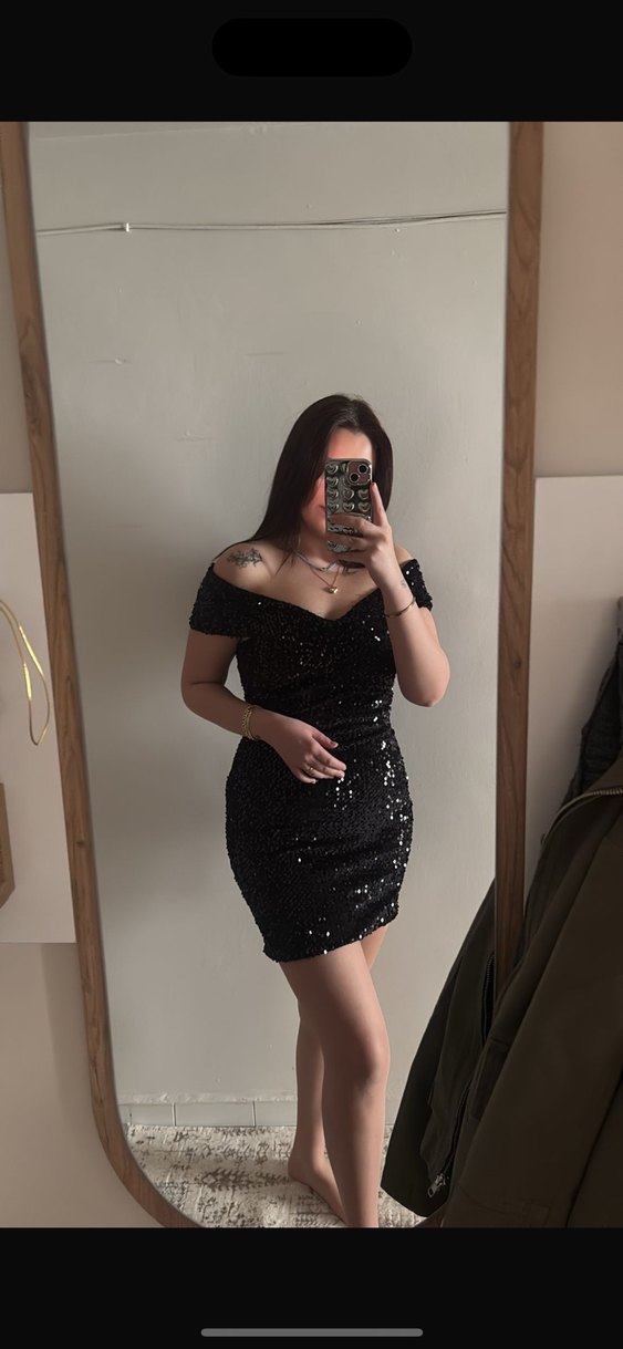 Parlak detaylara sahip, siyah ve v yaka, dar kesim mini abiye elbise. Gotik tarzda, çarpıcı ve romantik geceler için ideal. İnce askılı kolları bulunur. ✨