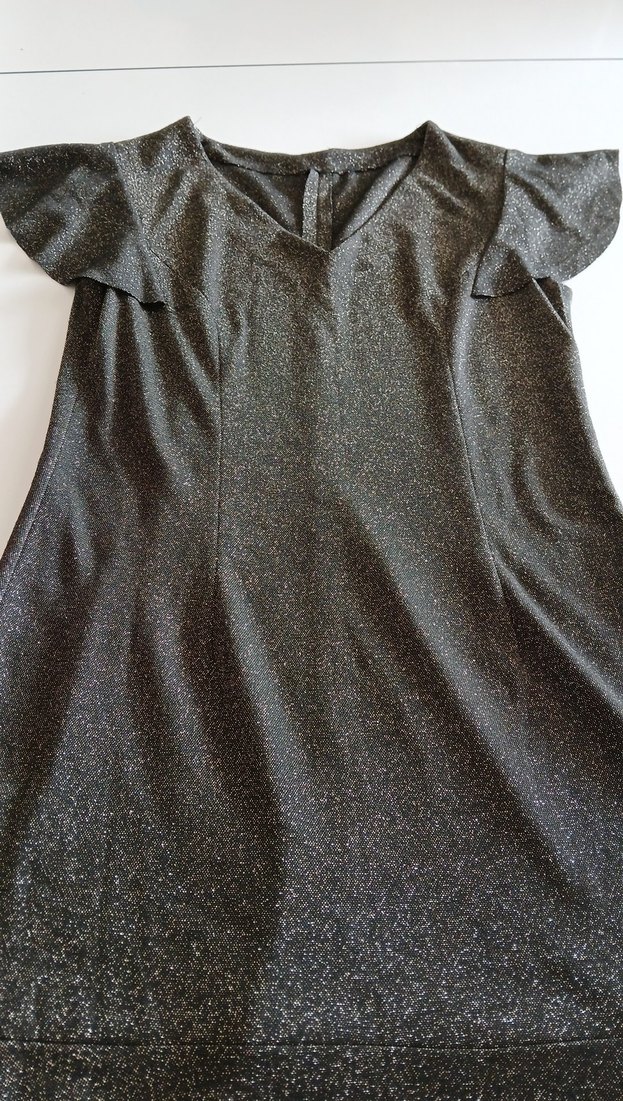Parlak siyah kumaştan, V yakalı, kısa kollu ve fırfırlı detaylı, rahat kesim hamile elbisesi. Parti için uygundur.