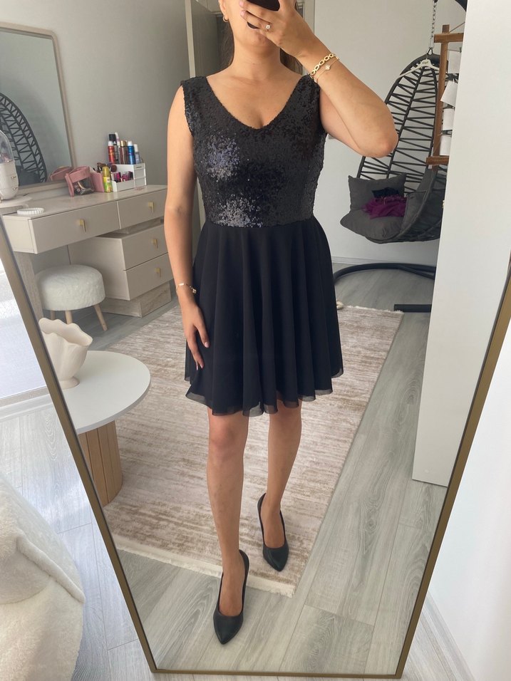Parlak V yakalı, kolsuz, oturan siyah kokteyl elbisesi, midi boyda ve romantik gece için ideal. ✨