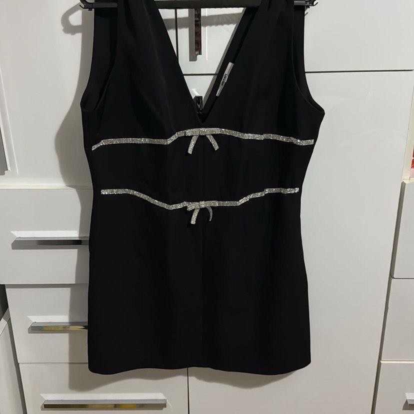 Siyah, V yakalı ve kolsuz, beli parlak detaylı kemerlerle vurgulanmış, oturan kesim mini elbise. Şık