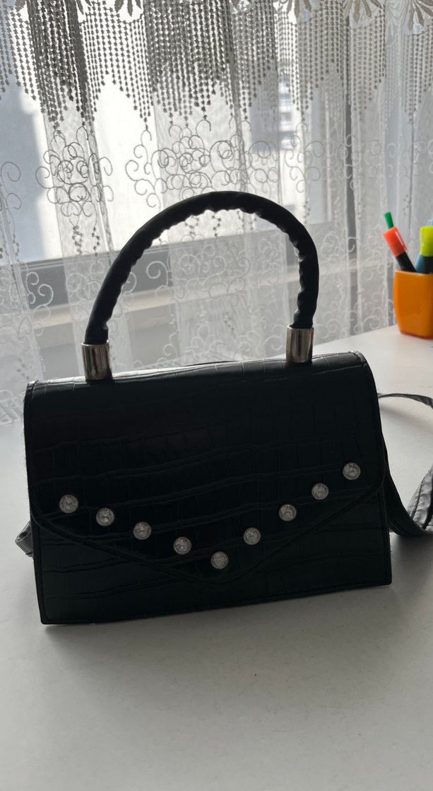 Parlak yılan derisi desenli siyah deri çanta, tokalı detaylarıyla gotik ve klasik şıklığı bir araya getiriyor. Günlük kullanıma uygun, Paris etkili bir tasarım.
