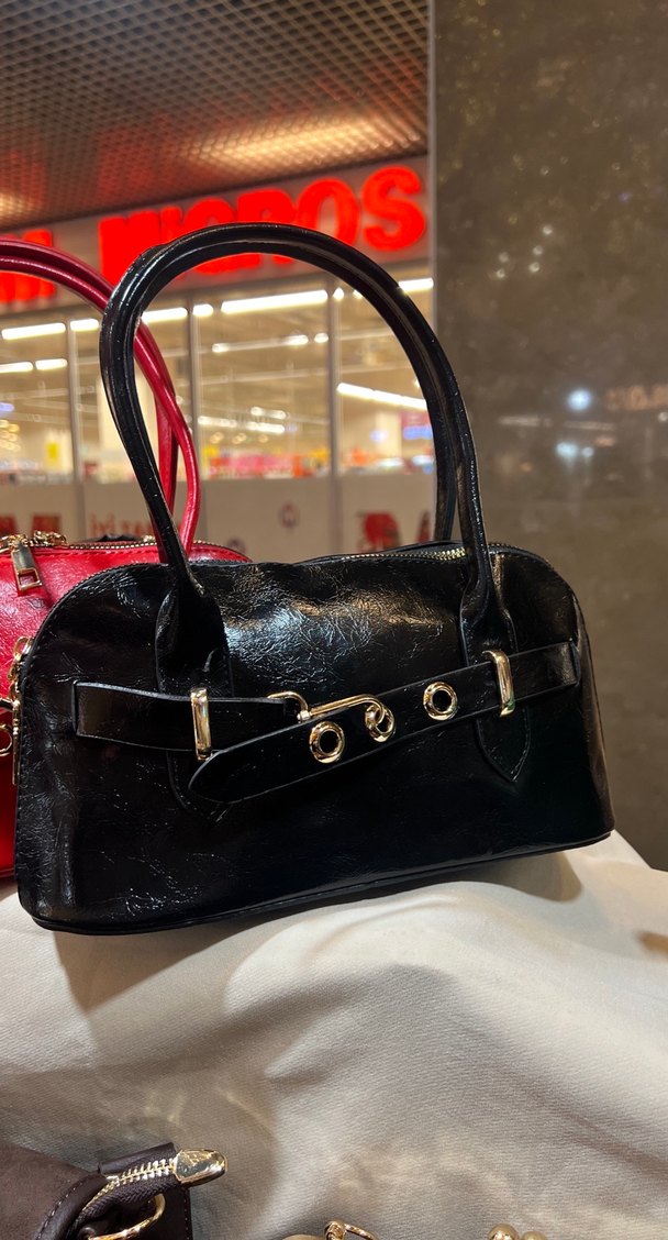 Parlak yılan desenli siyah deri çanta, tokalı detaylarla klasik ve gotik tarzı cesurca bir araya getiriyor.