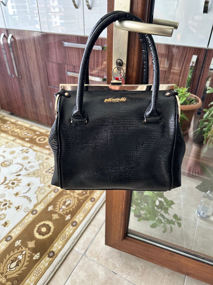Parlak siyah yılan desenli deri kadın çantası, tokalı detayı ve modern klasik tarzıyla Paris şıklığını yansıtıyor. Günlük kullanım için uygundur.