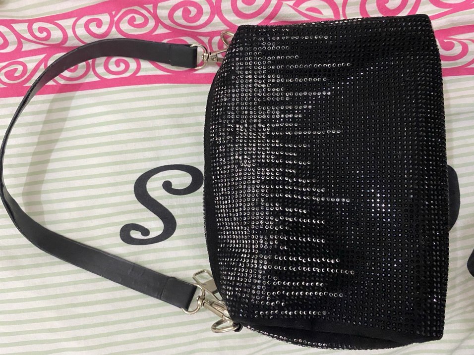 Parlak yılan deseni ve fermuarlı kapaklı siyah kadın çanta, sentetik kumaştan ve çıkarılabilir askılıdır.