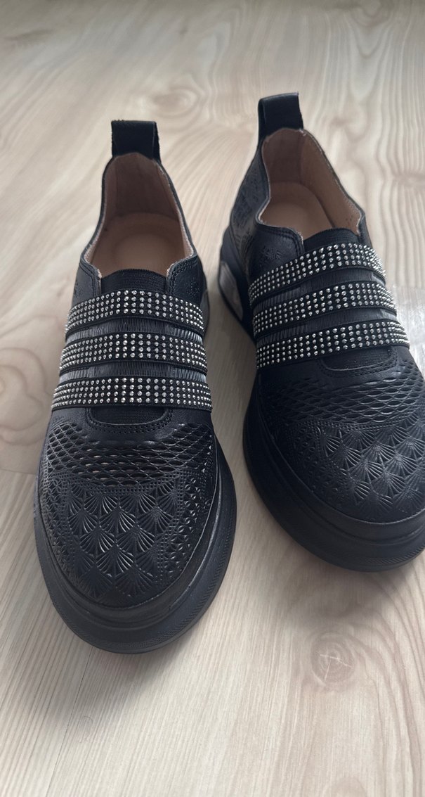 Kadın spor ayakkabılar, dolgu topuklu ve parlak siyah yılan desenine sahiptir. Kauçuk tabanlı, tokalı ve taşlı detaylıdır, trend sokak stili için uygundur.