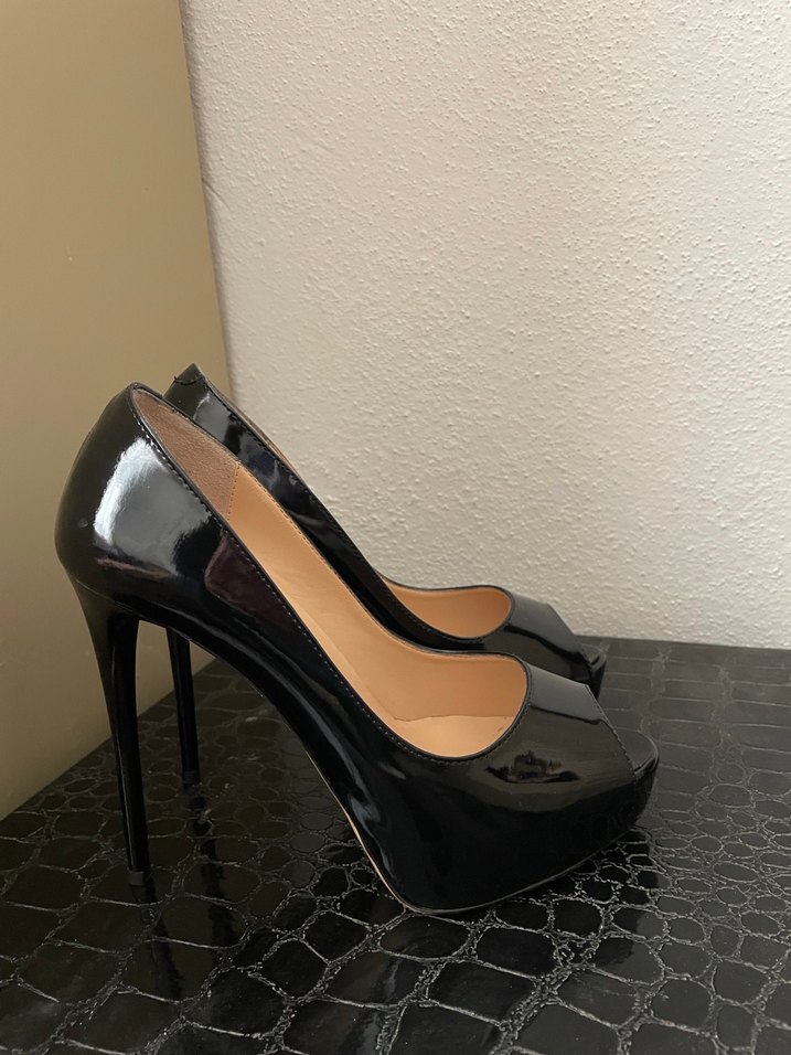 Parlak siyah yılan desenli yüksek topuklu stiletto, platform tabanlı modern tasarım. Romantik akşamlar için uygun.