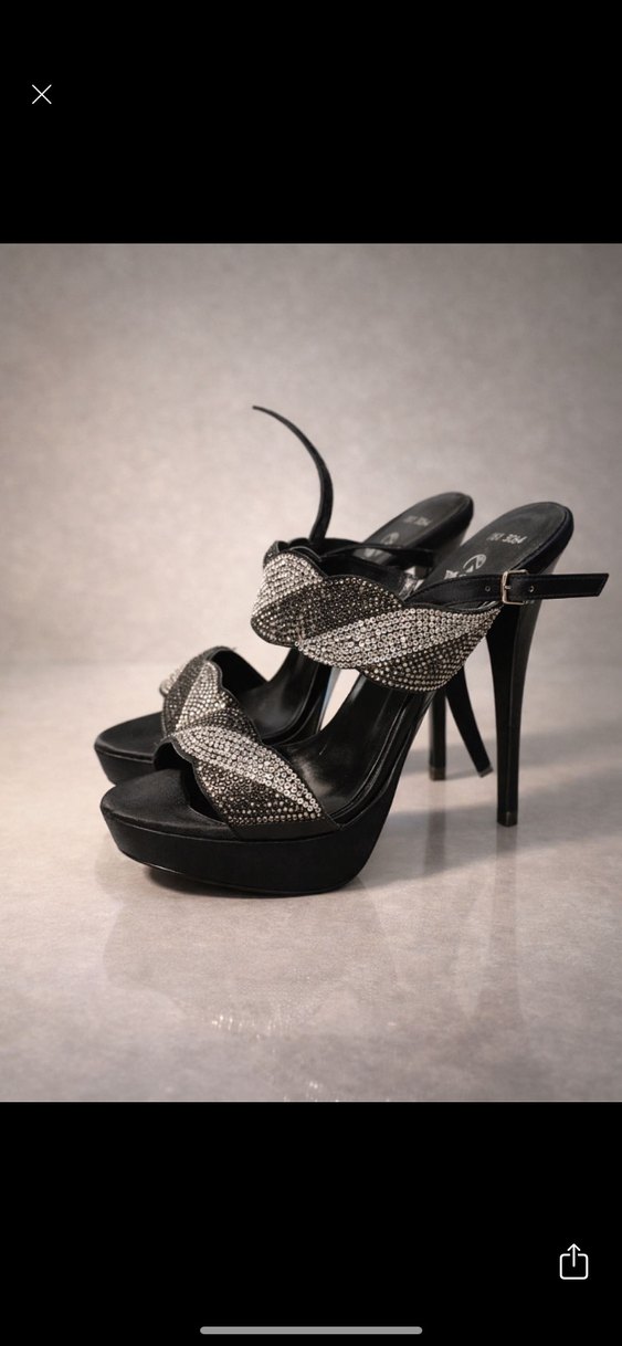 Parlak siyah yılan desenli ve payetli platform topuklu ayakkabılar, cesur ve göz alıcı bir görünüm sunar. Kauçuk malzemeden üretilmiştir.