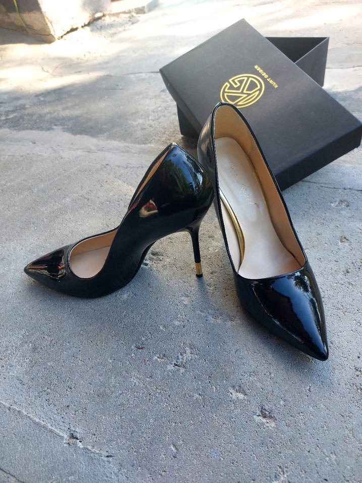 Parlak siyah yılan desenli stilettolar, tokalı detaylarıyla romantik akşamlar için uygundur. Sivri burun ve ince topuk modern klasik tarz sunar.