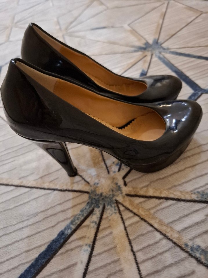 Parlak siyah, koyu yılan deseniyle rubber malzemeden yapılmış stiletto topuklu ayakkabılar. Klasik zarafet ve gotik Paris tarzını ofis için birleştirir.