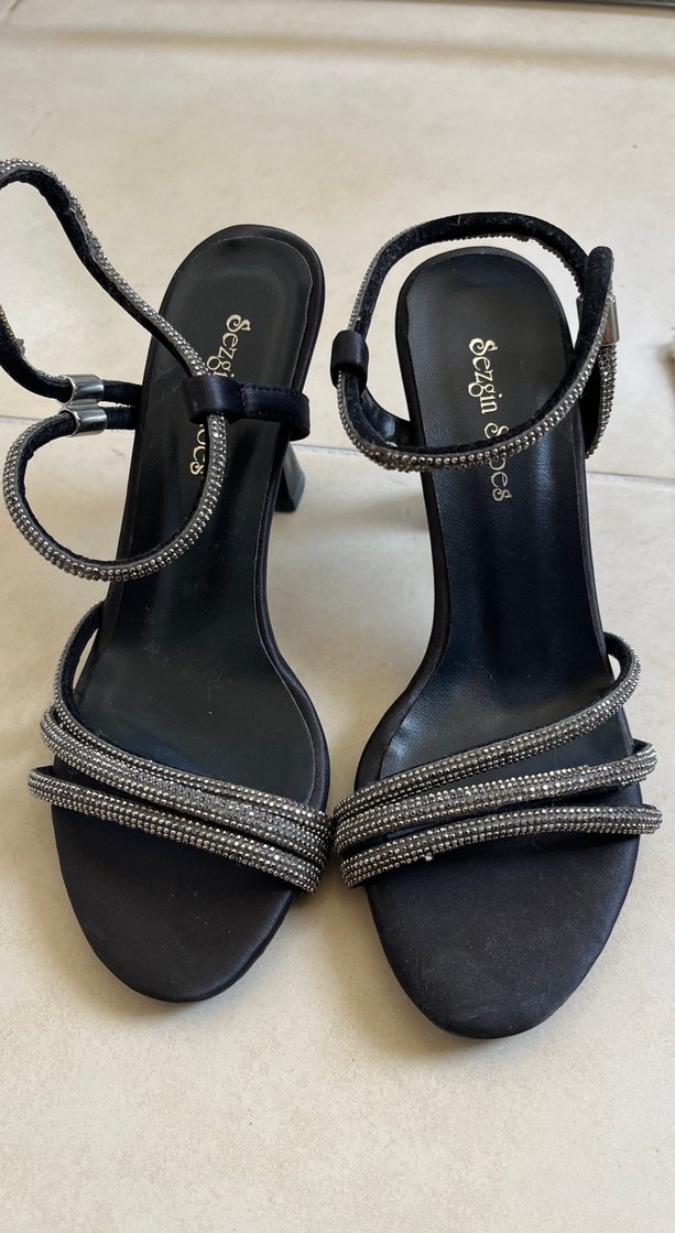 Parlak siyah yılan desenli stiletto topuklu ayakkabılar, tokalı kayışlarla ve kauçuk malzemeden, Sezgin & markasına ait. Romantik akşamlar için uygundur.