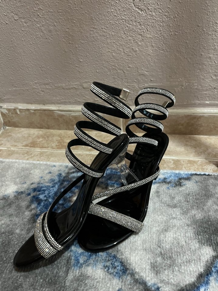 Parlak yılan desenli, tokalı siyah stiletto topuklu ayakkabılar, kauçuk malzemeden yapılmıştır. Trend belirleyiciler için çağdaş bir tarz sunar.