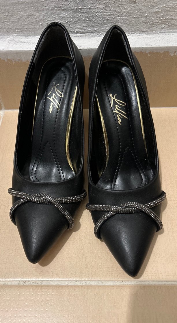 Parlak siyah yılan desenli, tokalı yüksek topuklu kadın ayakkabısı, ofis kullanımı için uygun.