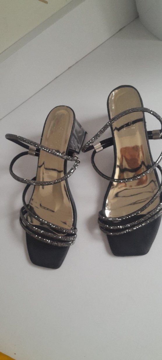 Parlak yılan desenli siyah topuklu ayakkabılar, tokalı kayışları ve blok topuğuyla romantik akşamlar için uygundur.