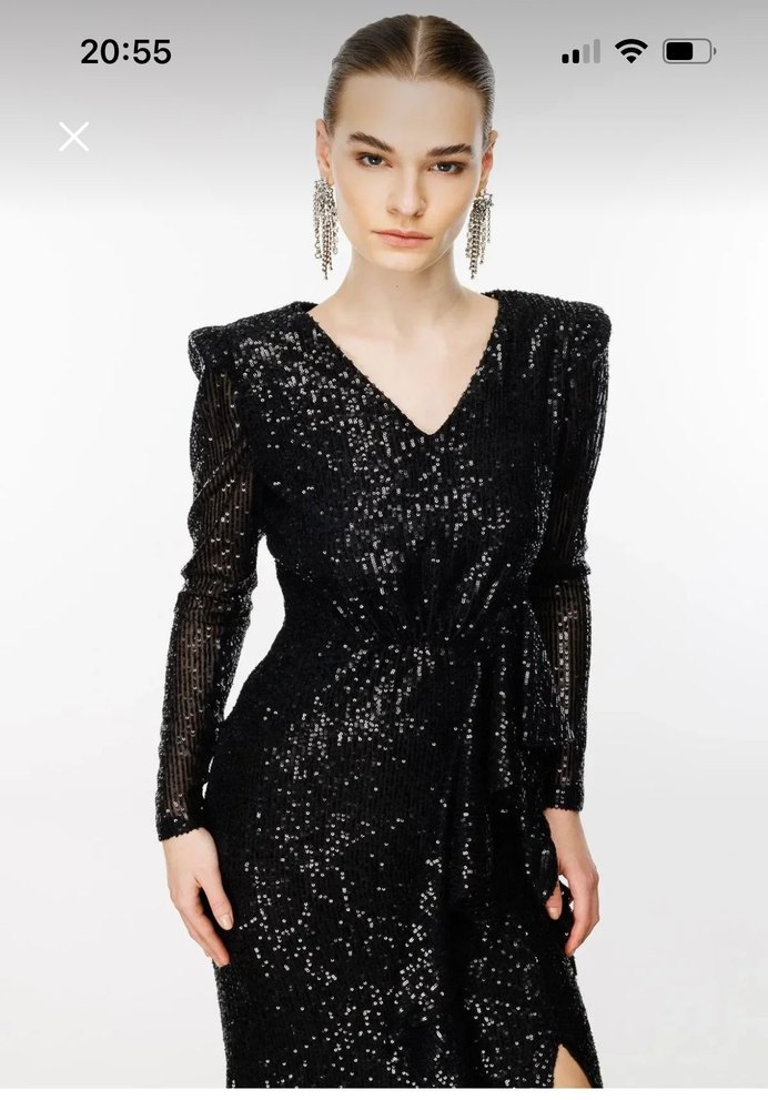 V yakalı, uzun kollu, parlak siyah yılan desenli, simli uzun elbise. Şık ve fit kesimiyle parti için uygundur.