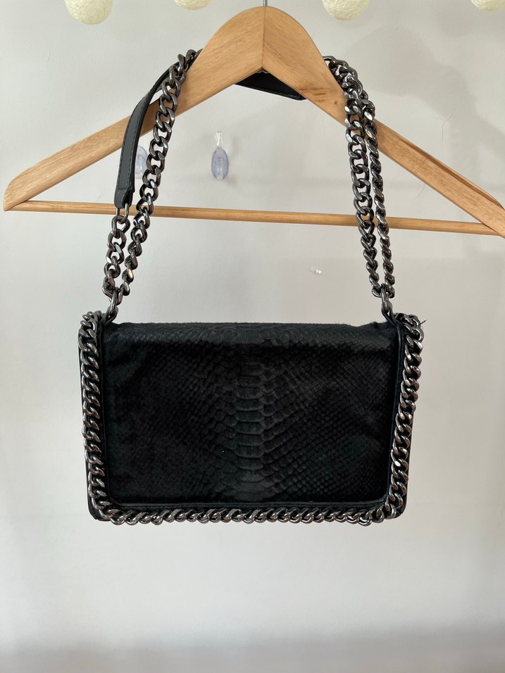 Parlak siyah süet malzemeden, yılan desenli ve zincir detaylı kadın çantası. Çağdaş Paris tarzında, trend günlük kullanım için uygun. Defoludur, zincirinde hafif solmalar vardır. Tüğlerinde çıkma vardır.