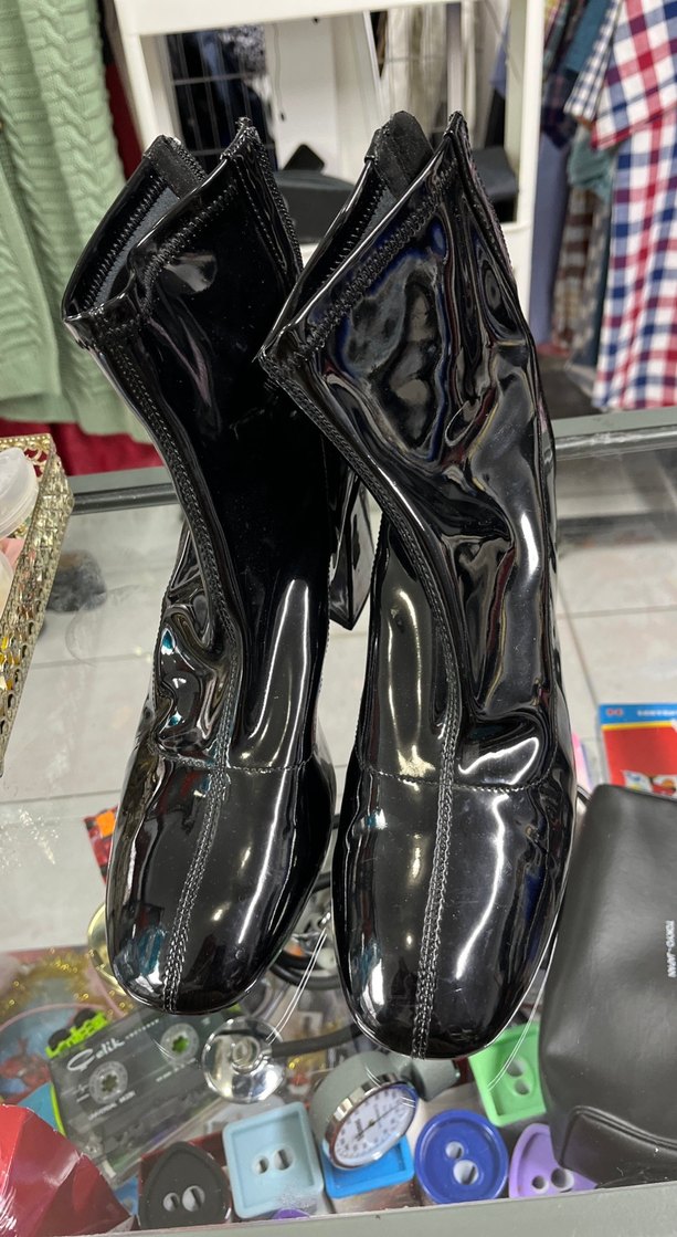 Parlak siyah kauçuk yüksek topuklu botlar, desen içermeyen şık tasarımıyla avant-garde ve modaya uygun görünüm sağlar.