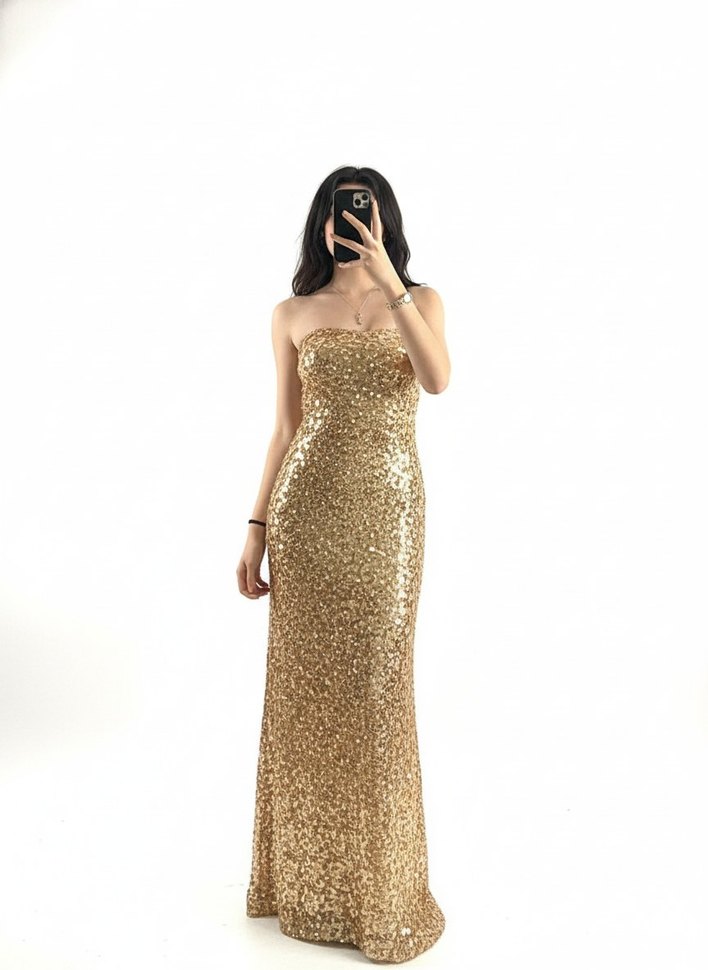 Parlak altın straplez ve vücuda oturan uzun abiye elbise. Kolsuz ve çağdaş tarzda, düğünler için uygun. ✨