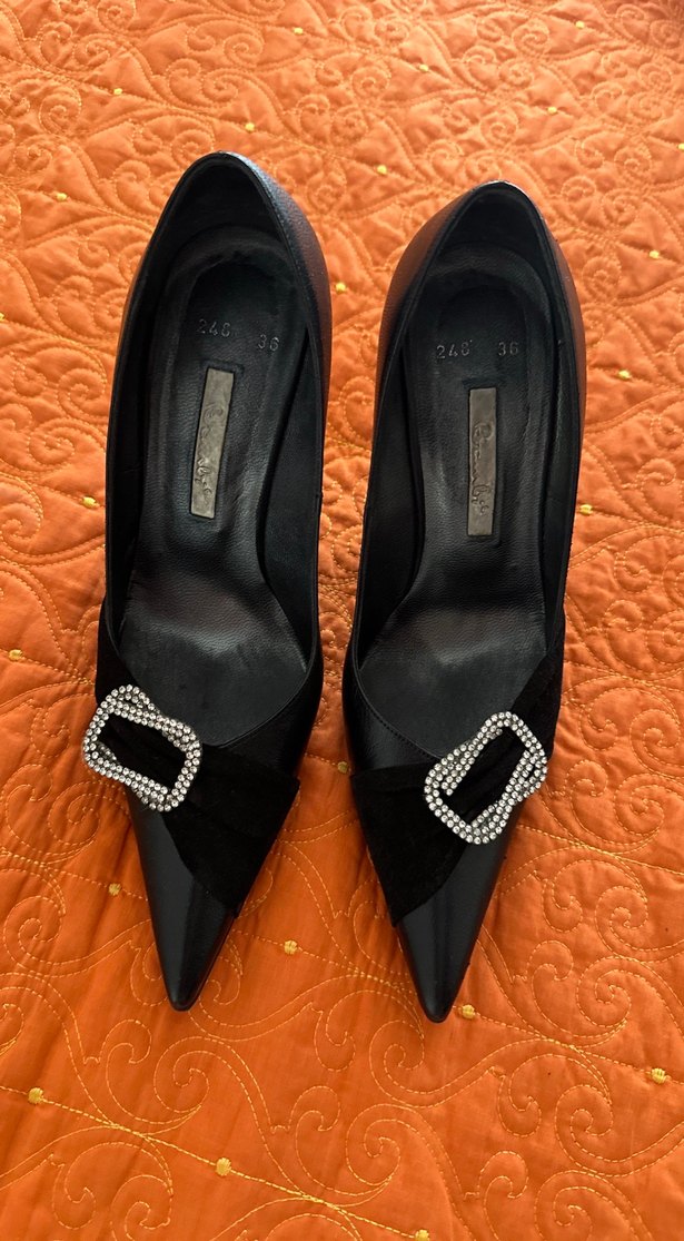Siyah süet topuklu ayakkabılar, sivri burun ve parlak taşlı toka detayı ile romantik akşamlar için ideal. Gotik klasik tarzda parlak desenlidir.