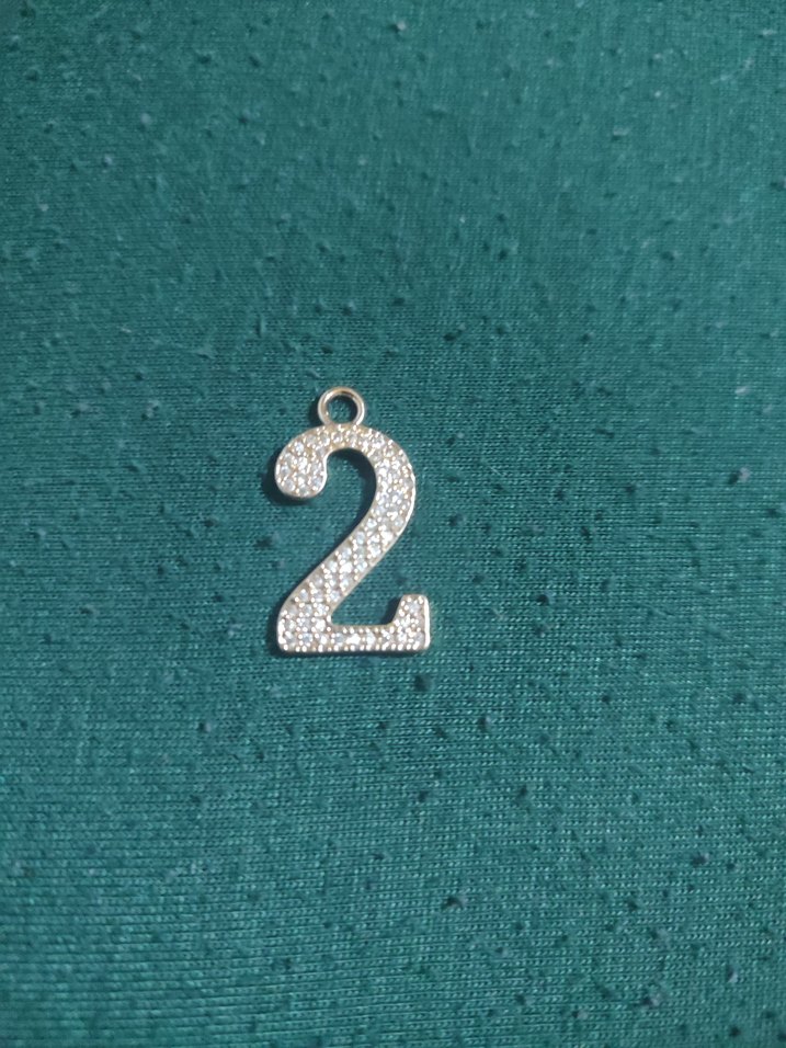 Parlak taşlarla süslenmiş, altın renkli 2 numaralı kadın charm. Minimalist tarzda, romantik geceler için uygun. ✨